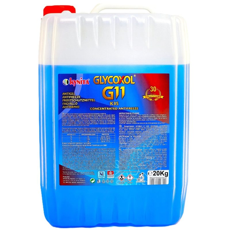 Antigel Auto Concentrat Glycoxol K35 G11 este un produs de nouă generație, destinat motoarelor moderne. Asigură o răcire eficientă a motorului, fără risc de fierbere, și oferă o protecție anticorozivă excelentă pentru toate metalele și aliajele utilizate în construcția sistemelor de răcire.
